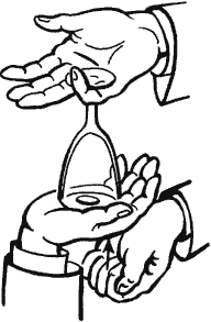 Убедив друзей и доверчивых подружек, что монета одна-единственная, опрокинь бокал на ладонь своему дружку. Ну, понятное дело, предельно осторожно! Все увидят только одну, двухрублевую. Далее дружок должен держать бокал вверх ногами. Да не дружок вверх ногами, а бокал вверх ногами, между двумя ладонями (смотри рисунок). Далее ты показываешь всем зрителям вторую копеечку. И говоришь: