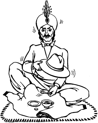 Потом кудесник опять отодвигает шляпу, а левой рукой достает из-под пиджака и кладет внутрь шляпы блюдечко. Фиксирует внимание зрителей-ребят на ложке, кладет рядом с ней шляпу с блюдцем. Опять приподнимает шляпу и показывает блюдце, а в это время правой рукой ведет шляпу к краю пиджака, одновременно захватывая с коврика чашку и также вводя ее внутрь шляпы. Потом кладет шляпу на пиджак рядом с блюдцем и, продолжая левой рукой что-то делать под пиджаком-курткой, приподнимает шляпу. И все видят: появилась чашечка!