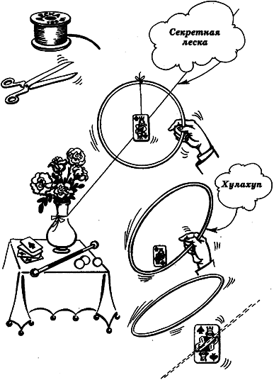 Для фокуса тебе потребуются следующие предметы: колода игральных карт или календарики, можно взять маленькие открыточки или фотографии друзей, иголка с тонкой белой ниткой, хулахуп и хулахупица (то есть ассистентка, которая и будет крутить этот хулахуп). А ты станешь крутить всех зрителей «за нос». Еще для фокуса нужна катушка черных ниток или тонкая леска, которую следует закрасить черным фломастером, и кусочек пластилина.