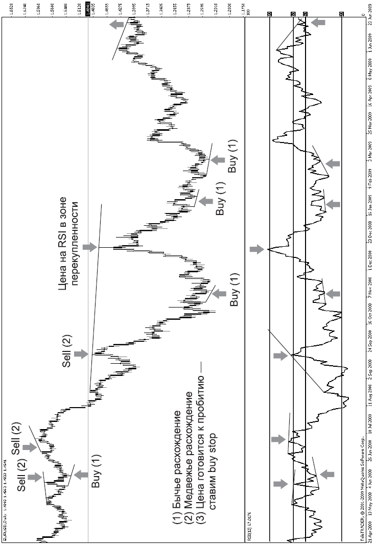 Сигнал на покупку будет особенно сильным, если предпоследний минимум RSI оказался под нижней вспомогательной линией, а последний – над ней. В случае медвежьего расхождения картина прямо противоположная. Сигнал на продажу особенно силен, если предпоследняя вершина RSI лежит выше верхней вспомогательной линии, а последняя – ниже.