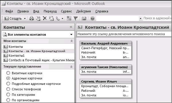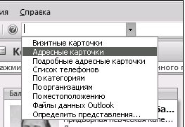 Чтобы увидеть контакты упорядоченными по категориям, найдите на панели задач небольшое меню со словами «Адресные карточки». Это меню переключения пользовательских представлений.