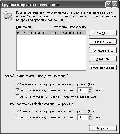 3. В появившемся окне «Группы отправки и получения» задайте требуемую частоту автоматической проверки почты.