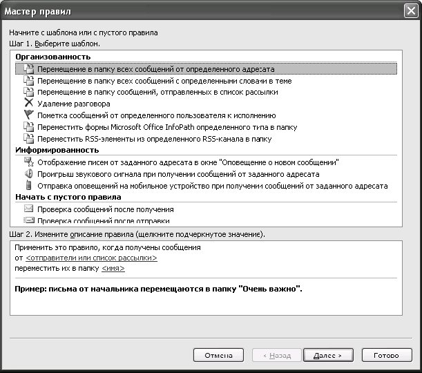 2. В появившемся окне «Мастер правил» выберите пункт «Перемещение в папку всех сообщений от определенного адресата» и нажмите «Далее» в нижней части окна.