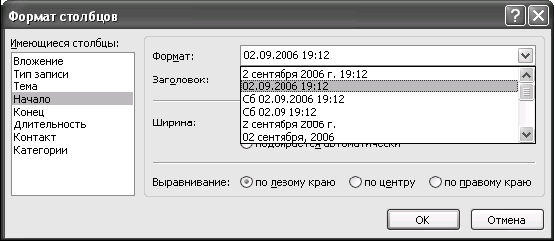 5. В появившемся окне «Формат столбцов» выберите формат типа «02.09.2006 19:12» (дата и время без дня недели).