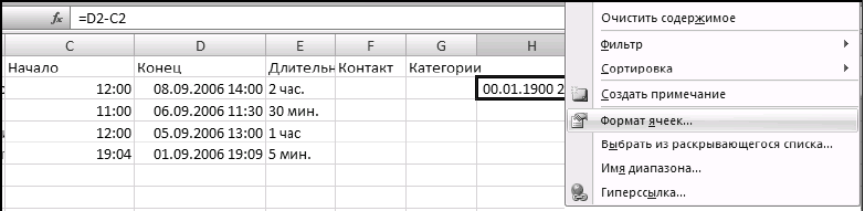 2. Кликните на этой ячейке с длительностью правой кнопкой мыши, выберите в появившемся меню «Формат ячеек».