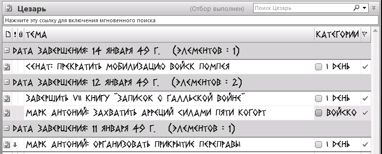 Кроме того, на панели задач все задачи окажутся логично отсортированными внутри категорий. Поскольку сортировка происходит сначала по важности, а затем по полю «Тема», то есть попросту по алфавиту (именно так мы настраивали параметры сортировки), внутри категории «Клиенты» мы увидим сначала все важные задачи, потом четыре задачи по проекту «Альфа», три по проекту «Бета» и так далее – по названиям проектов или клиентов в алфавитном порядке. Аналогично – в категории «Подчиненные» (по фамилиям или инициалам, с которых начинаются названия задач) и во всех других категориях.