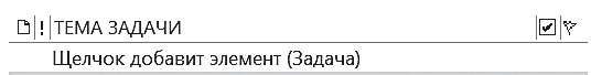 1. На панели задач, находящейся справа от календаря, поставьте курсор на строчку с серой надписью «Щелчок добавит элемент “Задача”». Впишите в эту строчку название любой вашей задачи, например: «Шеф: подписать заявление на отпуск». (Для названий задач справедливы те же правила, что и для встреч: начинаем с ключевых слов в именительном падеже, отделенных двоеточием.)