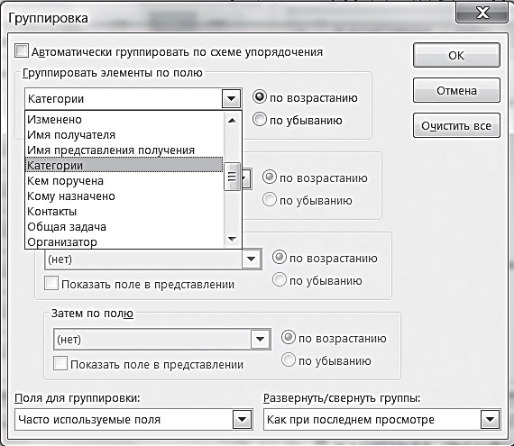 3. Появится окно «Группировка». В подменю «Группировать элементы по полю» выберите «Категории».
