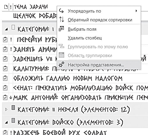 Сейчас мы научимся использовать самую, пожалуй, «вкусную» возможность Outlook – настройку пользовательских представлений. Пользовательское представление – это некий взгляд на ваш список задач, возможность представить их именно так, как хотите вы, пользователь. Первое, что мы сделаем в пользовательском представлении нашей панели задач, – сгруппируем задачи по категориям, то есть удобным нам контекстам.