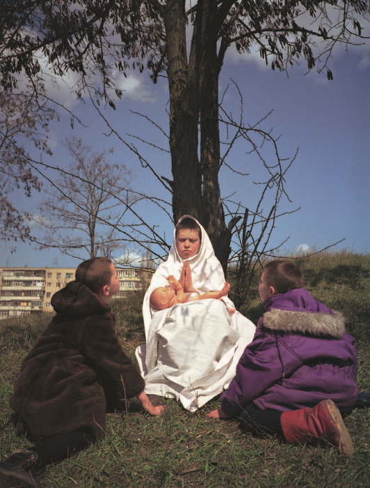 Похожее наложение нарочитости и документальности видно и в серии Сергея Браткова (род. 1960) «Итальянская школа» [56], которую он снимал в детской колонии в своем родном Харькове. Разрешение фотографировать детей Браткову дали только на том условии, что проект будет содержать в себе элемент религиозного просвещения. Братков решил, что будет ставить вместе с детьми, попавшими в колонию за бродяжничество, кражи и проституцию, пьесы по библейским мотивам – и все это будет происходить в пределах закрытой территории школы. После этого он делал снимки по ходу представлений.