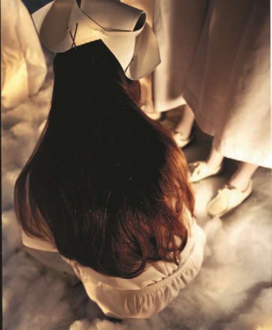 На фотографиях Анны Гаскелл (род. 1969) мы видим ту же напряженную сюжетность, для достижения которой использован целый ряд приемов «живых фотокартин»: дети в качестве моделей, иногда – с неразличимыми лицами, в их игре что-то не заладилось или возник элемент зловещего. Представленная здесь работа взята из серии «В приближении» [59]: у нее есть как литературная основа – перед нами Салли из «Приключений барона Мюнхгаузена» (1785) Рудольфа Распе (1737–1794), так и реальная – это история Женевы Джонс, детской медсестры, которая в 1984 году была обвинена в убийстве своих пациенток. Фотография представляет собой смесь привлекательного и жутковатого, в ней задействованы хорошая девочка и фетишистский статус костюма медсестры, а кроме того, она воспроизводит детскую игру, которая, судя по всему, приобрела зловещий оттенок. Физическая красота отпечатков, в сочетании с нравственной двусмысленностью их сюжета, позволяет получить странноватое зрительное удовольствие. Это, собственно, одно из основных свойств «живых фотокартин», в которых присутствует элемент жути, а именно тех работ, которые своим сюжетом вскрывают социальные язвы и ущемленность, но при этом, в эстетическом смысле, красивы и благообразны. Мы как бы слишком поздно осознаем истинный смысл того, во что нас втянули и чем заставили восхищаться.