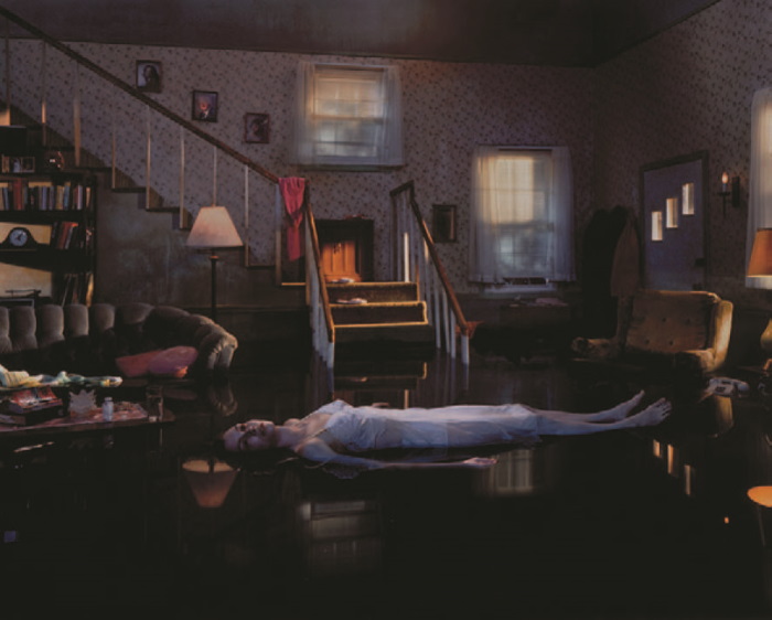На этой фотографии Крюдсон воссоздает образ шекспировской Офелии в декорациях американских пригородов послевоенного периода. Фотография входит в серию «Сумерки», где очень много подобных сложно выстроенных сцен, отсылающих к научно-фантастическим фильмам, притчам, современным мифам и театру.