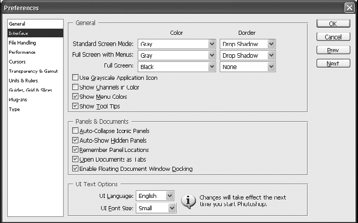 • UI Font Size (Размер шрифта элементов интерфейса). Список предлагает вам выбрать размер шрифта, которым отображаются командные меню, названия палитр и прочие элементы интерфейса. По умолчанию дается значение Small (Маленький). Вы же можете сделать его Medium (Средний) или Large (Большой). Надпись справа уведомляет, что изменения вы заметите только при последующем запуске программы.