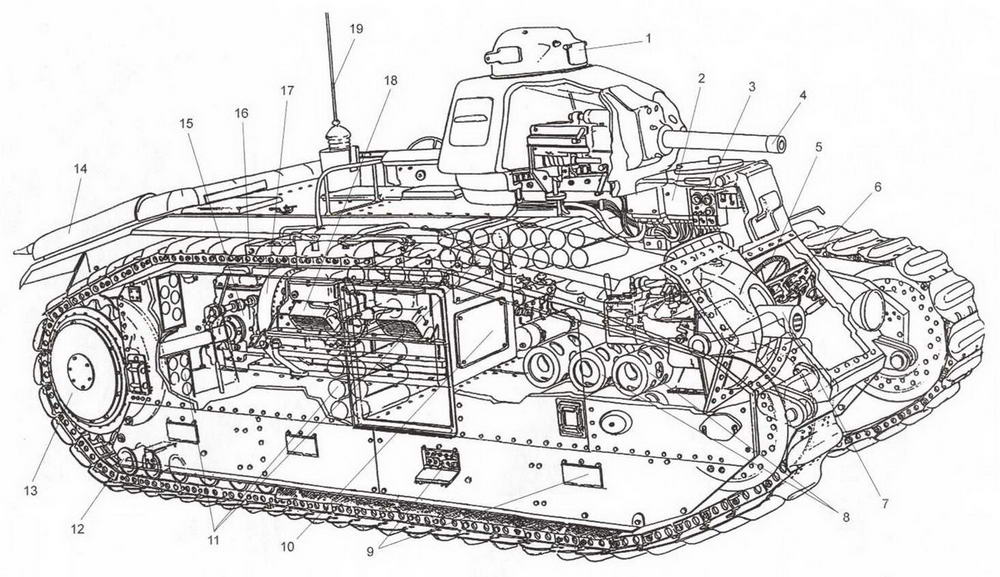1 — командирская башенка; 2 — электромагнитное реле; 3—щиток электроприборов; 4— 47-мм пушка; 5 — штурвал управления; 6 — щиток приборов механика-водителя; 7 — 75-мм пушка; 8 — пеналы для укладки 75-мм выстрелов; 9 — лючки для доступа к узлам подвески; 10 — люк для прохода в моторное отделение; 11 —укладки 47-мм выстрелов; 12— опорный каток; 13 —ведущее колесо; 14 — глушитель; 15—коробка передач; 16 — топливный бак; 17 —главный фрикцион; 18 — двигатель; 19 — антенна