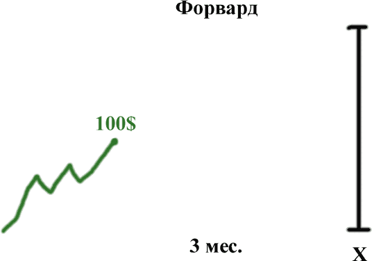 Теперь, чтобы лучше понять пример, не думаем о том, как в данном случае извлечь прибыль, а просто пытаемся понять логику всего процесса. Для этого представим себя производителями этого зерна, то есть некими фермерами. Мы – американский фермер – смотрим на цену на зерно, она равна 100 долл. (рис. 1.1). Эта цена нас вполне устраивает, и весь наш бизнес-план построен из такого расчета, что цена на зерно будет 100 долл. А именно – мы должны спланировать на определенный промежуток времени такие параметры, как оплата труда, кредиты, арендные платежи и различные другие моменты. Но зерна у нас сейчас нет. Зерно появится только через три месяца в некоторый день Х (рис. 1.2).