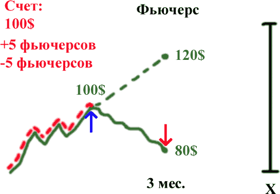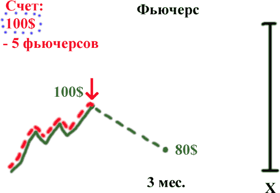 По цене в 80 долл. продали 5 фьючерсов. Теперь вспоминаем логику продажи фьючерса – я обязан продать 1 тонну зерна по цене 80 долл. в день Х. Значит, обязан купить за 100 долл., продать за 80 долл.