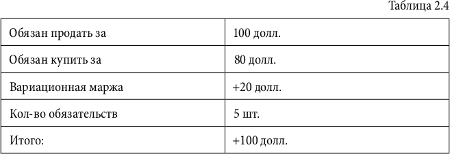 На рис. 2.8 можно увидеть, что когда-то было взято обязательство продать за 100 долл., а потом было взято обязательство купить за 80 долл. От перемены мест обязательств сперва продать, затем купить или сперва купить, а потом продать смысл расчетов не изменяется. Следовательно, вариационная маржа составит +100 долл. Расчет приведен в табл. 2.4.