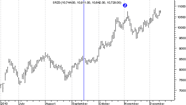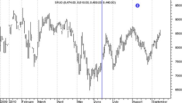 В табл. 3.2 я отразил более наглядно срок жизни фьючерсного контракта. Желтая область – период неликвидности, зеленая область – период ликвидности. Например, если обратить внимание на дату 10 сентября 2010 г., то можно заметить, что одновременно торговалось три фьючерса на акции Сбербанка. Фьючерс с поставкой 14.09.2010 истекал через несколько дней, фьючерс с поставкой 14.12.2010 набирал ликвидность и также уже торговался фьючерс с поставкой 14.03.11. Все эти три фьючерса были на акции Сбербанка и торговались в один день. Но при этом для построения склеенного графика используют только ликвидные периоды одного фьючерсного контракта игнорируя их неликвидные периоды. Наиболее ярко неликвидный период видно у фьючерса на акции Сбербанка с поставкой 14.09.2010 (рис. 3.9). Обратите внимание на график цен, который находится левее синей линии (неликвидный период). Можно увидеть большие ценовые разрывы (гэпы) или сильные ценовые выбросы (шипы).