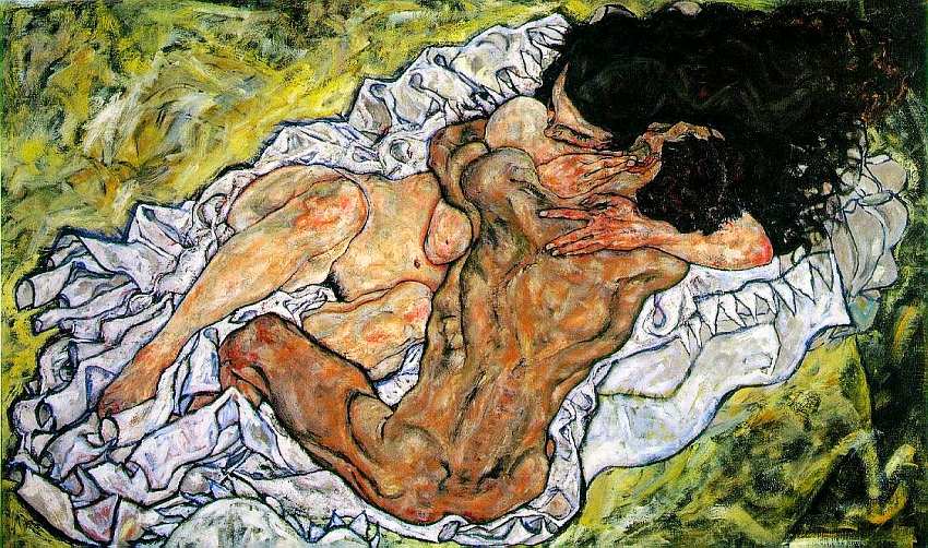 Второе название представленной картины — «Любовная пара II, мужчина и женщина». Данная тема роднит Шиле с другим знаменитым представителем австрийского модерна Густавом Климтом, но творчество первого более физиологично, оно экспрессивно в своем натурализме. Художник изображает буквально обтянутые кожей тела, где виден каждый напряженный мускул. Обращает на себя внимание их цветовая характеристика: светлый тон кожного покрова героини и темный — мужчины. Мужчины традиционно изображались с более темным цветом тела еще со времен древнейшего искусства Египта. Значима и общая гамма картины. Шиле работает в палитре постимпрессионистов и авангардистов, такое сочетание оливкового, охристого, бежевого, темно-коричневого и белого, подведенного черным, встречается, например, у Пикассо в период 1907–1914.