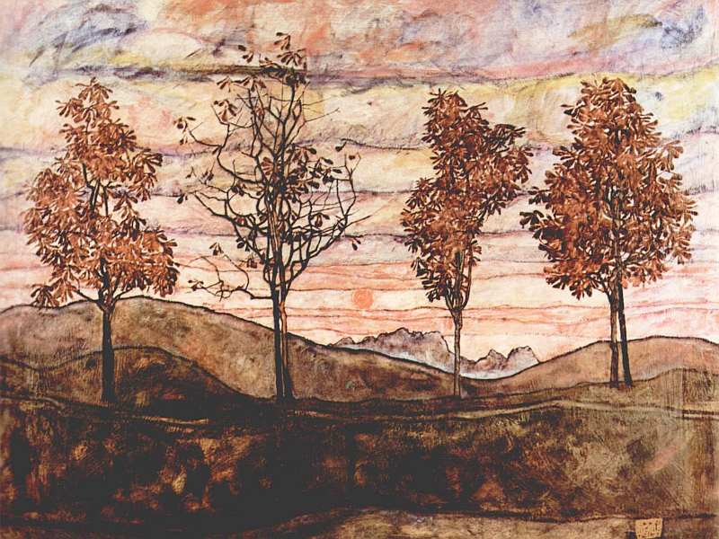 Работу «Четыре дерева» автор строит на прорисовывании слоев: каждая горизонталь отделяется от предыдущей толстым цветным контуром. Такой прием производит двойной эффект: делает пейзаж орнаментальным, а благодаря окрашенности слоев пронзительными розовыми и голубыми цветами приобретает экзистенциальный характер. Колорит картины рождает тревожное, даже грозное впечатление, ведь розовый и голубой цвета являлись для художников модерна символами жизни и смерти. Как говорил сам Шиле, движения облаков, рисунок деревьев, воды, гор напоминают ему движения человеческих тел. Мастер считал исходящие от природы импульсы родственными эмоциям, ощущениям и состояниям человека. Четыре дерева действительно выглядят как четыре человека с разными характерами, манерой поведения и внешностью.