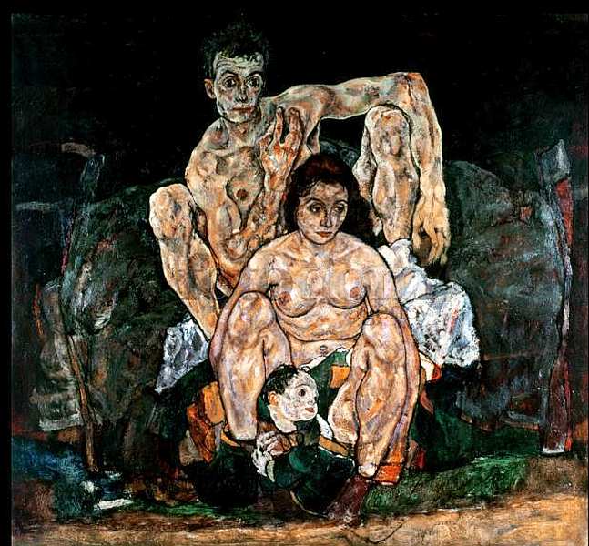 Чтобы понять данное произведение мастера, нужно знать его биографию. В 1918, когда Шиле было всего 28 лет, в Европе началась сильнейшая эпидемия гриппа, знаменитая «испанка», унесшая жизни более 20 миллионов человек. Картину «Семья» художник начал, когда еще ничего не подозревал о скором конце: он погиб через три дня после смерти беременной жены. Заболев, живописец начал переделывать полотно. Интересно, что изображенная женщина — не его жена, а неизвестная модель, автопортретными характеристиками обладает фигура мужчины. Работа осталась незаконченной. Взгляды героев поражают пронзительностью. Они, смирившись с судьбой, смотрят куда-то вдаль. Впечатляет жест мужчины — он прикасается к сердцу, словно приносит обет верности своей семье. На холсте властвуют коричневые земельные цвета, как будто герои уже находятся в лоне земли. В этом произведении меняется стиль Шиле, он становится более реалистичным, настроение картины очень мягкое, покорное, даже просветленное. От экспрессионизма осталась лишь драматическая символика цвета.