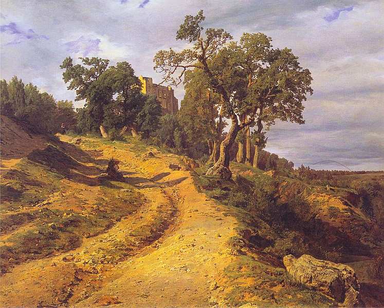 Данный небольшой пейзаж очень гармоничен и прост. Большую часть холста занимает проезжая ухабистая дорога. Сразу видно, что места заброшенные, сюда редко заглядывают люди. Название картины подсказывает причину — дорога ведет к руинам старой крепости. Интересно, что замок Лихтенштейн действительно принадлежал тому самому роду Лихтенштейнов, которые основали одноименное карликовое государство. Он построен еще в 1135,