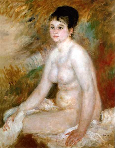 Пьер Огюст Ренуар является одним из самых известных и сложных по творческой манере художников Европы рубежа XIX–XX веков. Эта простая по сюжету работа демонстрирует характерные особенности таланта Ренуара. В своих лучших вещах мастер органично объединял импрессионистическую манеру наложения краски с неоклассической идеализирующей вневременной атмосферой полотен и какой-то особой реалистической осязаемостью тела. Именно эти парадоксально соединенные черты создают в работах Ренуара манящую зыбкость и неоднозначность настроения. Обнаженные женщины — одна из любимых тем художника, в изображении которой он не только блестяще проявлял дар колориста, но и создавал очень интимные и типические портреты знакомых ему дам.