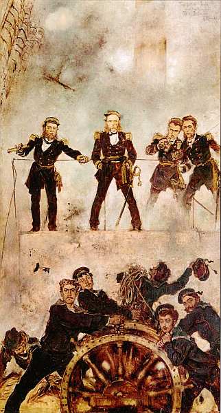 Антон Ромако — один из самых талантливых австрийских художников второй половины XIX века. Его свободная живописная манера и глубокое чувство цвета оказали влияние на такого художника-новатора, как Оскар Кокошка. Ромако на этой картине очень экспрессивно пользуется цветом, пытаясь воссоздать накаленную атмосферу сражения. Выдающийся адмирал предстает перед зрителем в центре как герой или божество, он выделяется на фоне мощных водяных брызг. Спокойствие и решимость адмирала контрастируют, но при этом удивительным образом дополняются эмоциональностью моряков у штурвала. Автор делает всех персонажей произведения во главе с Тегетгоффом очень похожими друг на друга, почти сводит на нет портретные черты, тем самым подчеркивая настроение и характер боя, во время которого все участники становятся как будто единым организмом.