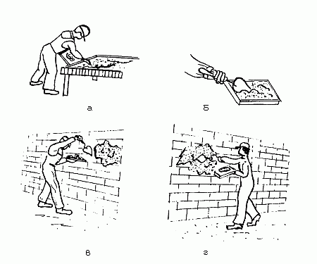Рис. 56. Набрасывание раствора на вертикальные и горизонтальные поверхности с сокола: а – набирание кельмой раствора из ящика и перекладывание его на сокол; б – захватывание раствора правым ребром кельмы перед набрасыванием на поверхность; в – набрасывание раствора справа налево; г – набрасывание раствора слева направо