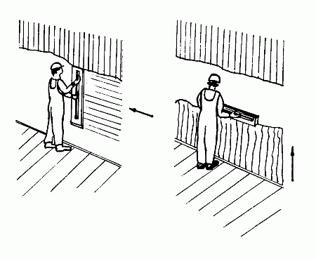 Рис. 57. Разравнивание раствора на поверхностях большими полутерками при улучшенной штукатурке вертикальными и горизонтальными движениями