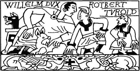 Герцог Вильгельм Нормандский сидел в одной из роскошных палат руанского дворца за громадным столом, заваленным разнообразными книгами. Перед ним лежал план нового шербургского порта, а возле него – рукопись любимой книги герцога «Комментарии Цезаря», из которой он заимствовал многие полезные сведения. Эта рукопись была испещрена заметками, сделанными смелой рукой герцога. Несколько длинных стрел с разной отделкой было небрежно брошено на архитектурные рисунки строящегося аббатства. В открытом ларчике превосходной работы, подаренном королем Эдуардом, лежали письма от разных государей, искавших дружбы Вильгельма или угрожавших его спокойствию. За спиной герцога сидел его любимый норвежский сокол, без клобучка, так как он не пугался гостей; в дальнем конце палаты уродливый карлик с очень умным лицом рисовал на мольберте сражение при Вольдедюне, которое стало примером блистательных подвигов Вильгельма на поле брани. Эта картина рисовалась для герцогини, которая желала перенести его на канву.