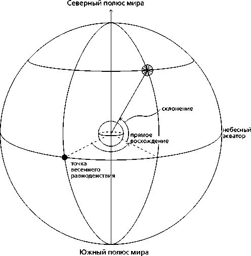 Поскольку наши представления о дневном и ночном небе «прикованы к Земле» и во многом зависят от нашего географического местоположения и времени суток, астрономы, стремясь принять все это во внимание, разработали специальную картографическую систему координат. Она называется экваториальной, и, по сути, это проекция земной градусной сетки с ее координатами долготы и широты на небесную сферу (рис. 2.3). Чтобы увидеть ее в действии, рассмотрим небесный экватор — большой круг, проекцию экватора Земли на космическое пространство. Небесные широты к северу или югу от небесного экватора измеряют в градусах, угловых минутах и угловых секундах (обычно эти единицы сокращенно обозначают символами °, ?, ?), где 1 градус равен 60 угловым минутам, а 1 угловая минута насчитывает 60 угловых секунд. Небесную широту астрономического объекта, как правило, называют склонением (в астрономии оно обозначается как ? или Dec, от латинского слова declinatio — «наклон»). Созвездие Ориона находится на небесном экваторе, и поэтому его склонение близко к 0°. Полярная звезда, напротив, сейчас находится вблизи Северного полюса мира (проекция земной оси на небесную сферу), и поэтому ее склонение очень близко к +90°. (Магнитная ось Земли постоянно отклоняется от оси вращения планеты, и Северный магнитный полюс в настоящее время располагается примерно на 86-й параллели северной широты.)