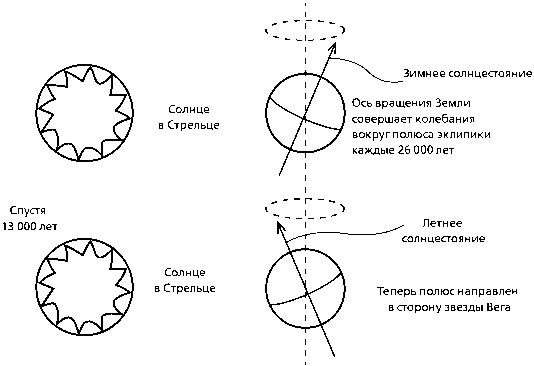 Но это еще не все. Прецессионное движение земной оси сместило даже времена года. Представим, что сейчас 21 декабря и Земля находится в той части своей орбиты, когда Солнце пребывает в южном созвездии Стрельца, а северный полюс земной оси максимально отклонен от Солнца (рис. 2.5). Мы отмечаем это время как зимнее солнцестояние в Северном полушарии и летнее солнцестояние в Южном. А если мы теперь перенесемся на 13 000 лет вперед и вообразим Землю в той же части ее орбиты, то увидим, что земная ось на целых 57° отклонилась от направления, в котором она указывает в наши дни. Северный полюс мира в это время окажется в Веге, и поэтому 21 декабря северный полюс земной оси будет направлен к Солнцу, Стрелец расположится на северном небосклоне, а зимнее солнцестояние в Северном полушарии станет летним (в Южном все будет наоборот).