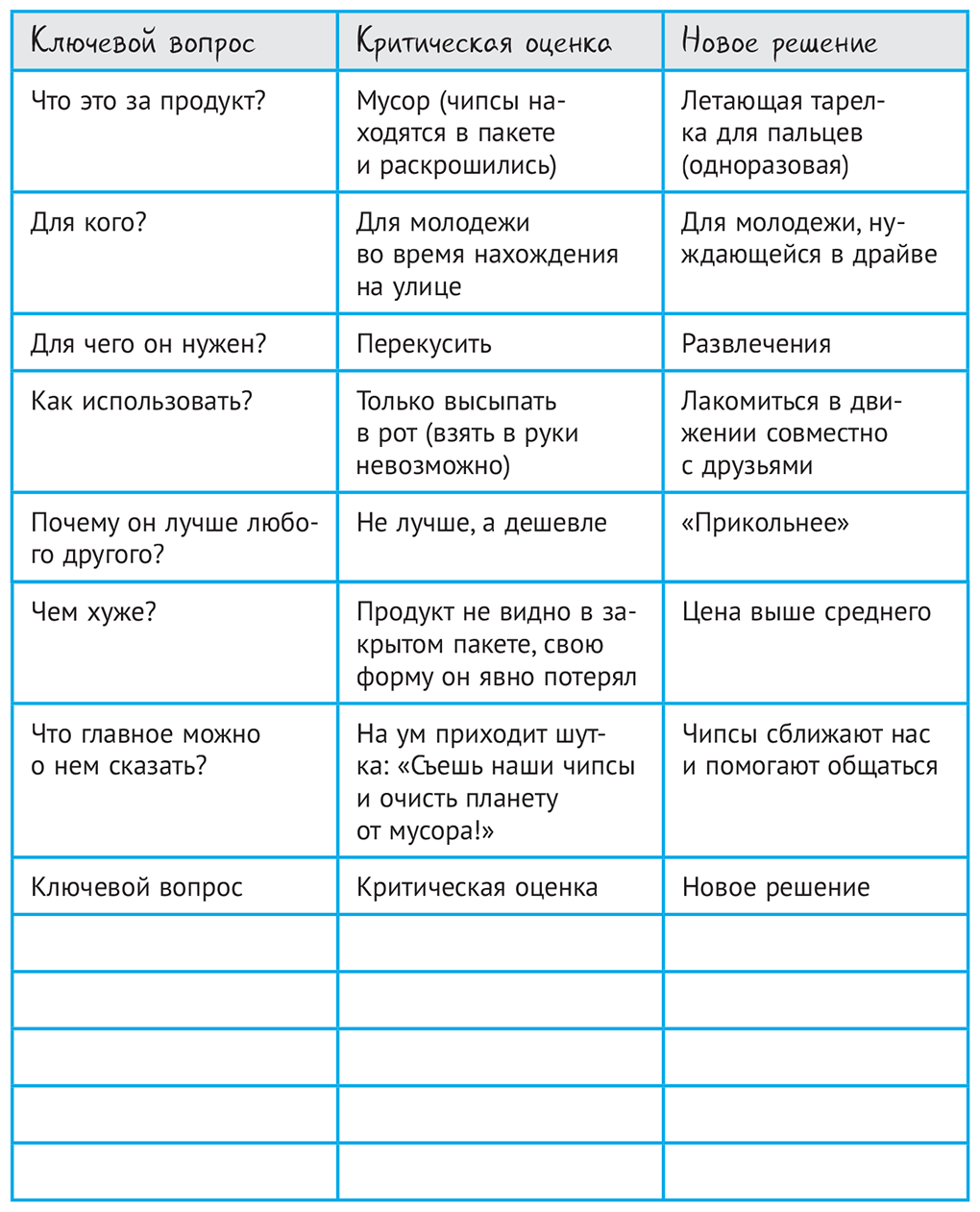 В таблице 1. заполню 7 пунктов по трем столбцам. 5 остальных пунктов оставлю для вашего продукта незаполненными. Познакомившись с примерами 7 решений нужно добавить свой вариант по чипсам в 5 пустых строк.