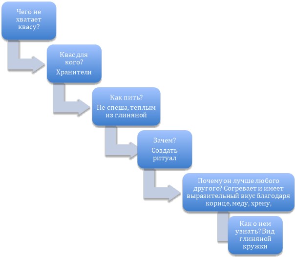 • В этой миссии, на каждом этапе трассы (Рис. 1) применим сокращенный вариант, состоящий из двух элементов: «Ключевой вопрос», например, «Чего не хватает квасу?» и «Инсайт-ответ» например, «Традиция».