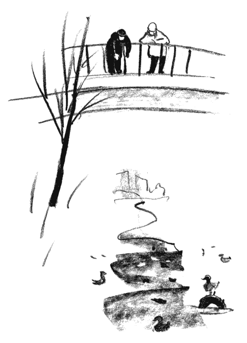Подошла бабушка в зелёном пальто, за руку она держала девочку в смешной шапке с кроличьими ушами. Бабуля достала из чёрного ридикюля батон хлеба, отломила кусок и дала девочке. Та принялась крошить батон уткам. Бабуля и нам протянула кусок батона.