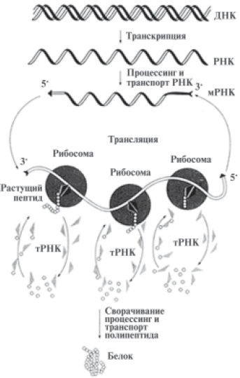 Перезапись генетического текста и перевод в белковый текст (транскрипция и трансляция)