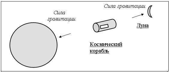 (Рисунок 7.1. Что происходит с астронавтами, когда они спят. Где верх, и что считать низом? Надписи на рисунке, снизу вверх, слева направо: Земля; Сила тяготения; Космический корабль; Сила тяготения; Луна)