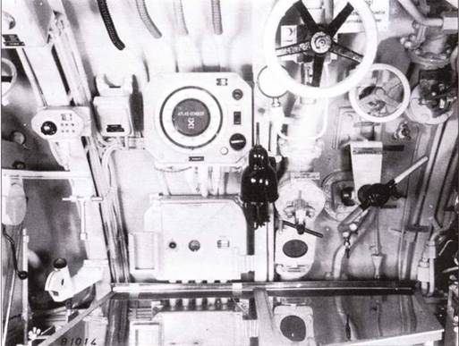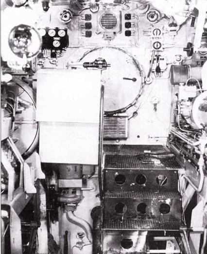 Правый борт центрального отсека подлодки U 190. На фото видны шахта перископа а слепа от неё главный масляный насос. Справа спереди приёмник и передатчик локатора FuMo-29 «Gema». Позади приборы и подъёмная шахта штыревой антенны, которая работает при движении на перископной глубине. На задней плане приборы управления дифферентом лодки: вспомогательный и дифферентный насосы и распределитель сжатого воздуха.