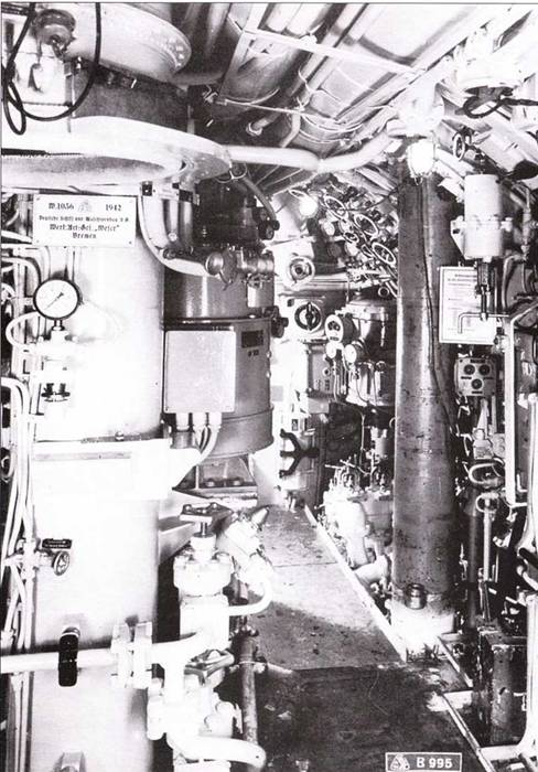 Правая сторона дизельного отсека между Д-шпангоутами № 35 и 17 подлодки U 190. Слева баллон сжатого воздуха для запуска дизелей, другой такой же баллон позади верстака. Над ними система тяг и рычагов клапанов балластных цистерн № 4 и переключатель подачи моторного масла. По обе стороны от машинного телеграфа топливные заслонки правой цистерны и 4 соответствующих подающих вентиля.