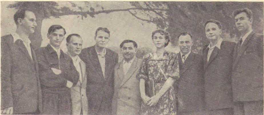 Участники обороны крепости в Минске (1956 г.). Слева направо: М. П. Гуревич, П. С. Клыпа, Ф. Ф. Журавлев, автор книги С. С. Смирнов, С. М. Матевосян, Р. И. Абакумова, П. М. Гаврилов, А. И. Махнач, А. А. Виноградов