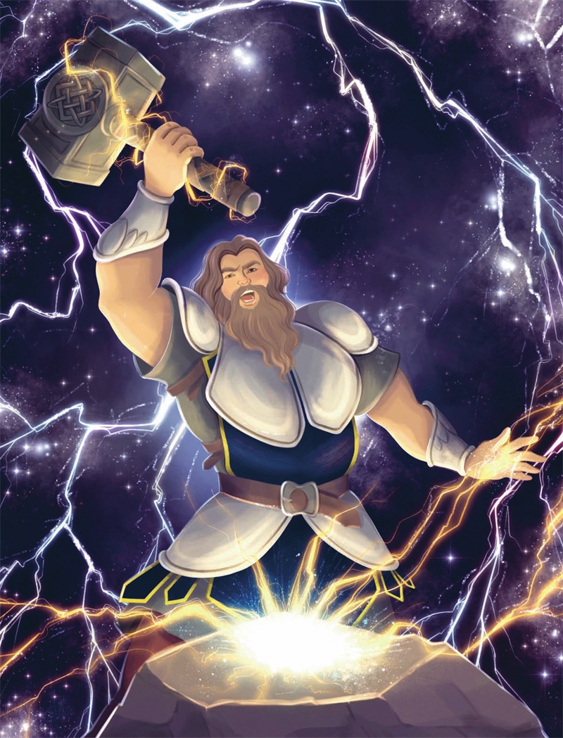 Но Сварог не только труженик, он храбрый воин. В доспехах цвета красного восхода мчится верховный бог на коварных врагов. И людям выковал меч, палицу, секиру. Вручил русичам с одним из главных своих законов: землю-матушку от чужеземцев, не щадя жизни, защищать. Много заповедей передал он людям, и в них чистым огнём горят слова: «справедливость», «знание», «трудолюбие»…