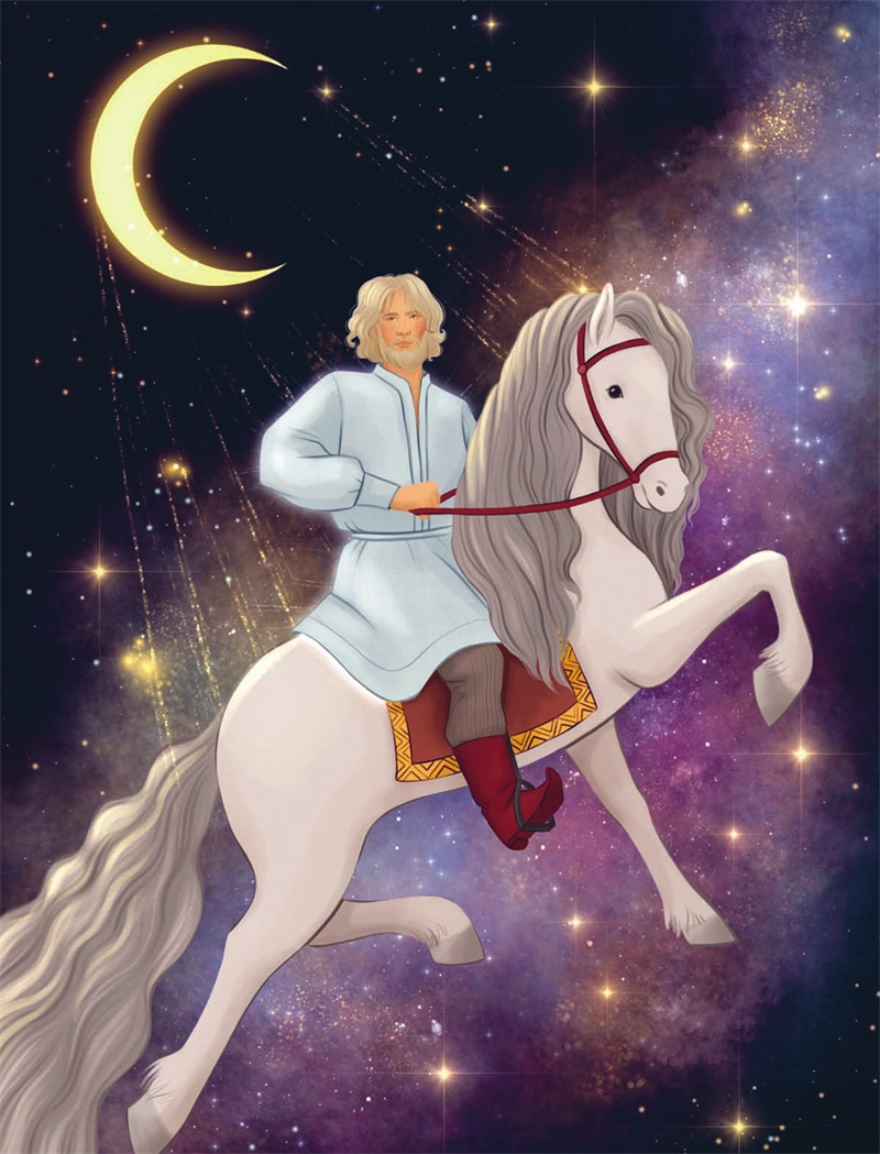 Тьма отступает: на просторы ночи выезжает белый, с жемчужным отливом конь. Серебром блестят кудрявые волосы бога лунного света Хорса. От его холщовых рубахи и плаща исходит слабое таинственное сияние. И отступают тени и страхи ночи. В стороне различают путники дорогу, ведущую к спящей деревне. Спешат по ней крестьяне, громко благодаря хорошего бога.