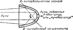 — Во время первых опытов я брал источником света несколько обычных стеариновых свечей. Путём установки гиперболоида (В) я доводил «лучевой шнур» до толщины вязальной спицы и легко разрезывал им дюймовую доску. Тогда же я понял, что вся задача — в нахождении компактных и чрезвычайно могучих источников лучевой энергии. За три года работы, стоившей жизни двоим моим помощникам, была создана вот эта угольная пирамидка. Энергия пирамидок настолько уже велика, что, помещённые в аппарат, — как вы видите, — и зажжённые (горят около пяти минут), они дают «лучевой шнур», способный в несколько секунд
