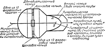 Это просто, как дважды два. Чистая случайность, что это до сих пор не было построено. Весь секрет в гиперболическом зеркале (А), напоминающем формой зеркало обыкновенного прожектора, и в кусочке шамонита (В), сделанном также в виде гиперболической сферы. Закон гиперболических зеркал таков:
