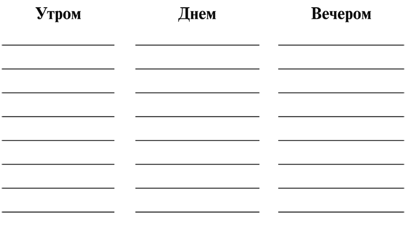 Теперь несколько минут подумайте, что вы просите ребенка делать или не делать в течение обычного дня. Затем перечислите все эти ежедневные «сделай» и «не делай» в отведенном ниже пространстве на странице.