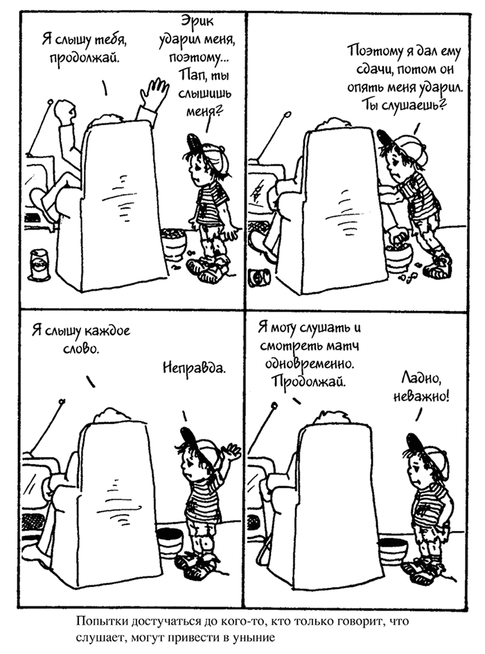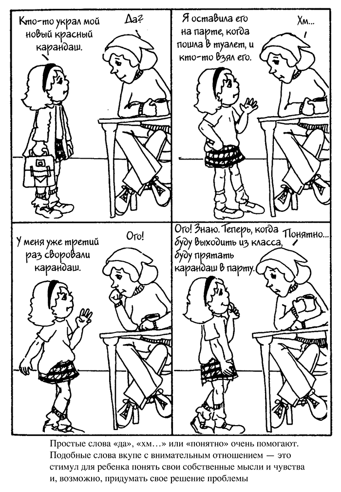 Вы могли подумать: «Ладно, в этом упражнении я смог дать такой ответ, который показал, что я понял чувства ребенка в той или иной степени. Но куда дальше потечет разговор? Как мне его продолжить? Нормально будет дальше дать совет?»