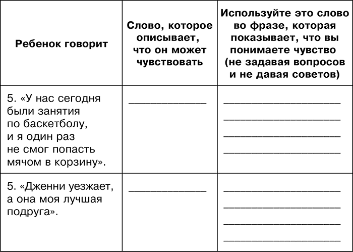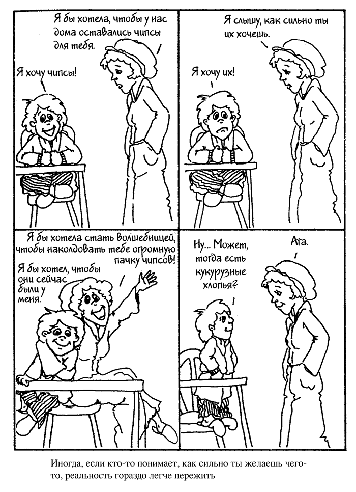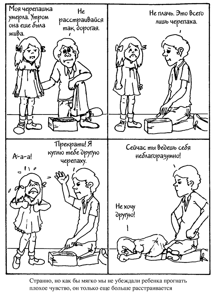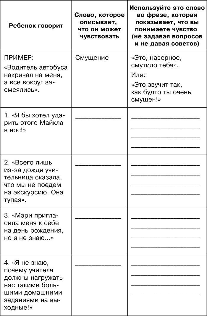 Из четырех навыков, которые мы проиллюстрировали, самый сложный – это способность выслушать детские излияния, а затем «назвать чувство». Нужны практика и сосредоточенное внимание, чтобы вникнуть в то, о чем говорит ребенок, и определить, что он или она может испытывать. Кроме того, очень важно дать ребенку запас слов