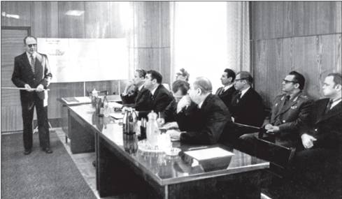 Совещание в УКБТМ. Председательствует главнокомандующий Сухопутными войсками — заместитель Министра обороны Е.Ф. Ивановский. Докладывает главный конструктор танка Т-72 В.Н. Венедиктов