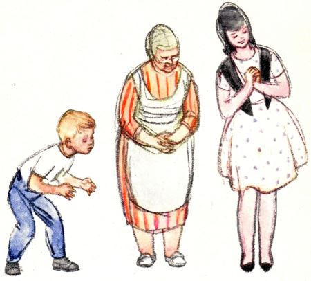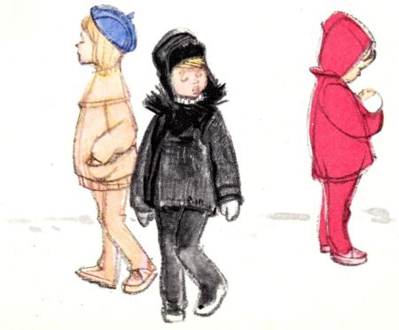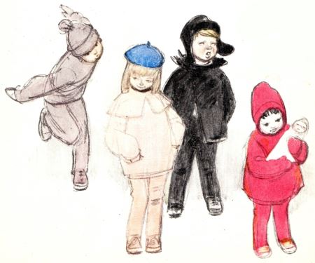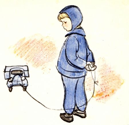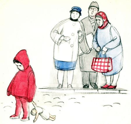 Во дворе уже гуляли: девочка в синем берете, девочка с куклой, мальчик-самолёт. Этот мальчик играл в самолёт. Он бегал по двору. Руки у него были крыльями. И он всё время гудел: „Ры-ры-ры…“ Как мотор.